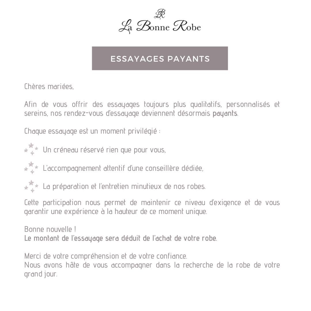 chacune à ses attentes qui lui sont propres, en fonction des ses envies, de sa morphologie, de son lieux de réception, de son budget, etc… Nous pouvons donc simplement vous donner quelques petites astuces, comme prévoir ses rendez-vous d’essayages environ 6 à 8 mois avant son jour J, même si nous sommes l’une des rares boutiques grâce à notre concept à pouvoir répondre à une mariée ‘’de dernière minute’’. Etre accompagnée, mais pas trop (3 à 4 accompagnants maximum) pour ne pas être perdue dans ses choix, faire un point sur les modèles qu’ont aiment ‘’visuellement’’ sans pour autant se fermer à essayer d’autres choses, pour ne pas passer à côté de LA bonne robe. Enfin ne pas hésitez à aller voir les commentaires (notes) sur google ou les plateformes spécialisées, afin de se faire une idée des prestations de la boutique repérée, car rien ne remplace l’expérience vécue par d’autres mariées, expérience que nous nous attachons à rendre inoubliable chez La Bonne Robe.